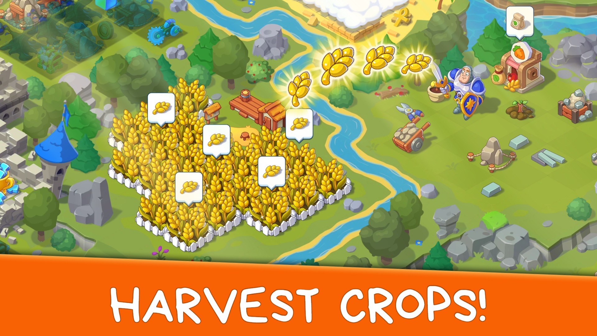 Tap on resources like wood, stone, or crops to merge them into tools and structures, following prompts on the screen for guidance.