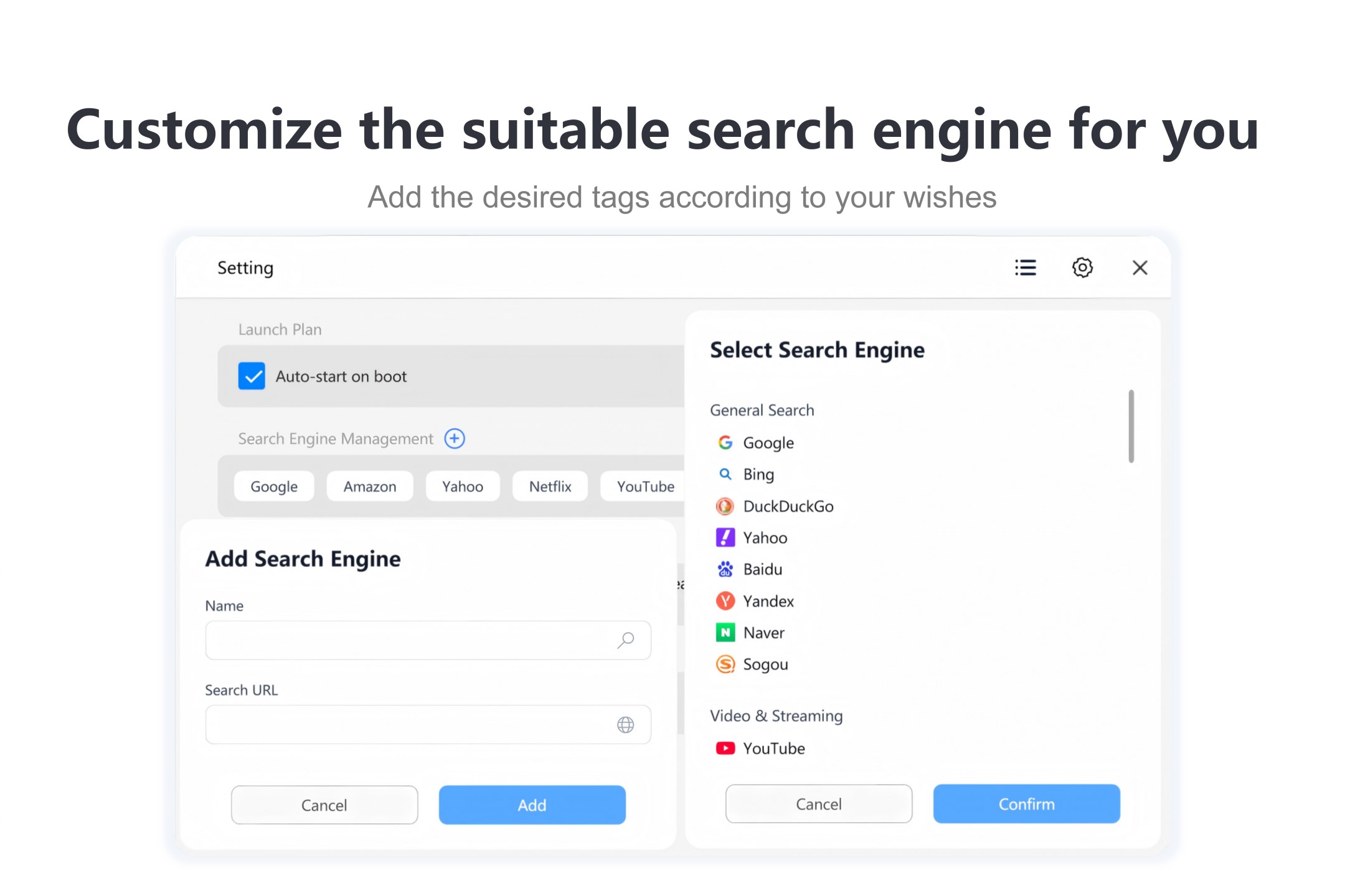 Yes, go to Settings > Search Engine to select and customize your preferred search providers like Bing, DuckDuckGo, TikTok, or Amazon.