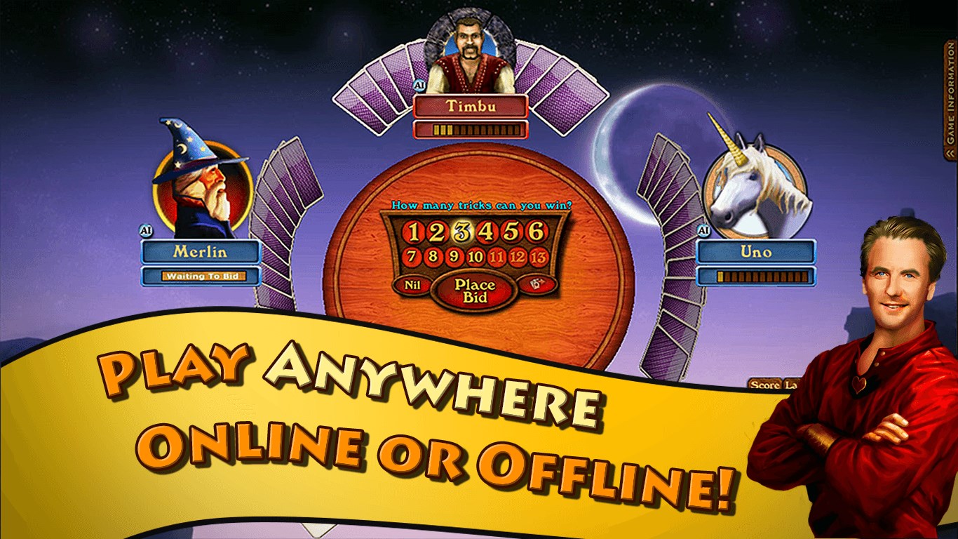 During gameplay, players bid the number of tricks they expect to win. Scoring awards points for successful bids; failing to meet bid results in penalties. Details are in Settings > Rules.