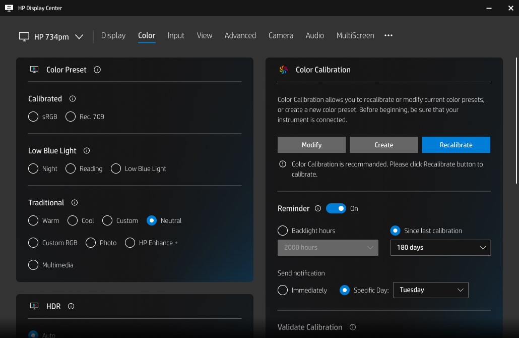 Navigate to Color Calibration or Advanced Settings in the app under Settings > Display to fine-tune color, brightness, and ergonomics.