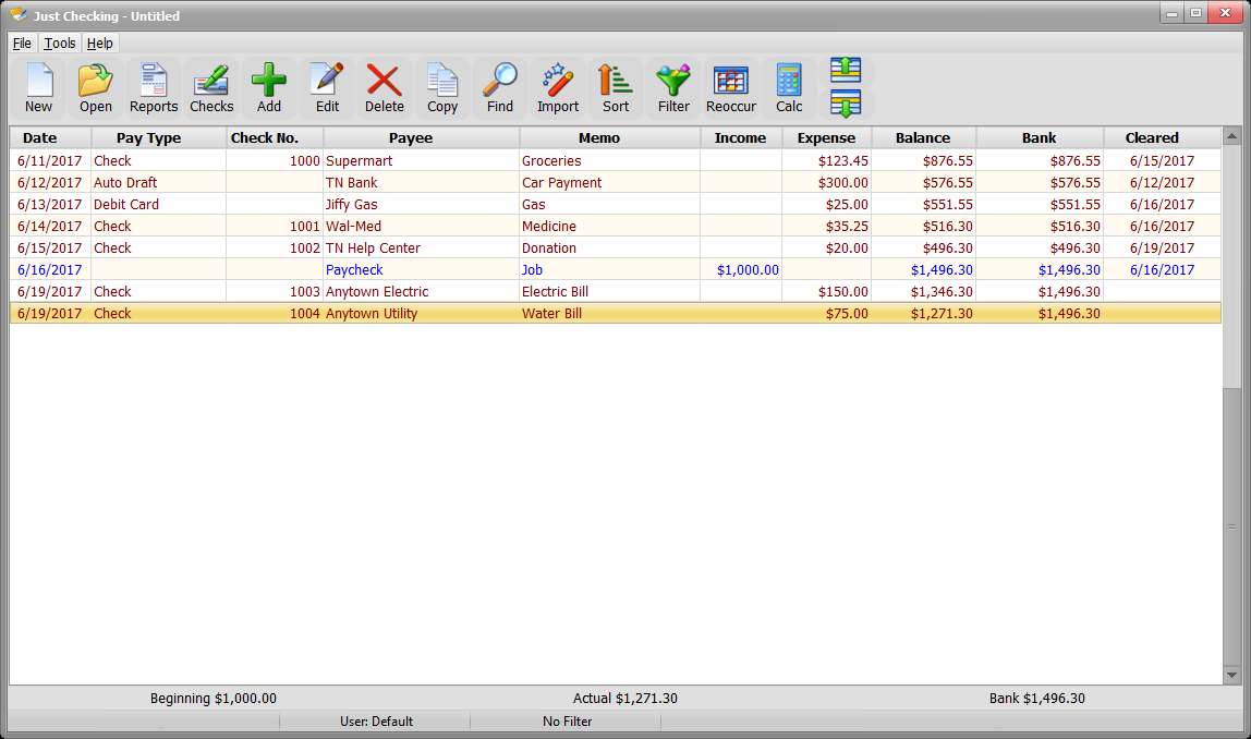 Enter transactions, mark them as cleared, then compare your balance to statements and disable sorting if needed for precise reconciliation.