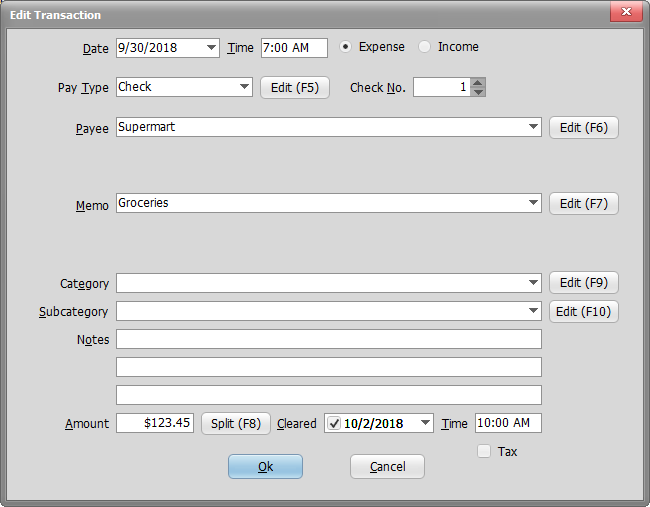 Tap Add Transaction, fill in details, assign categories, and save. Use split transactions for multiple categories.