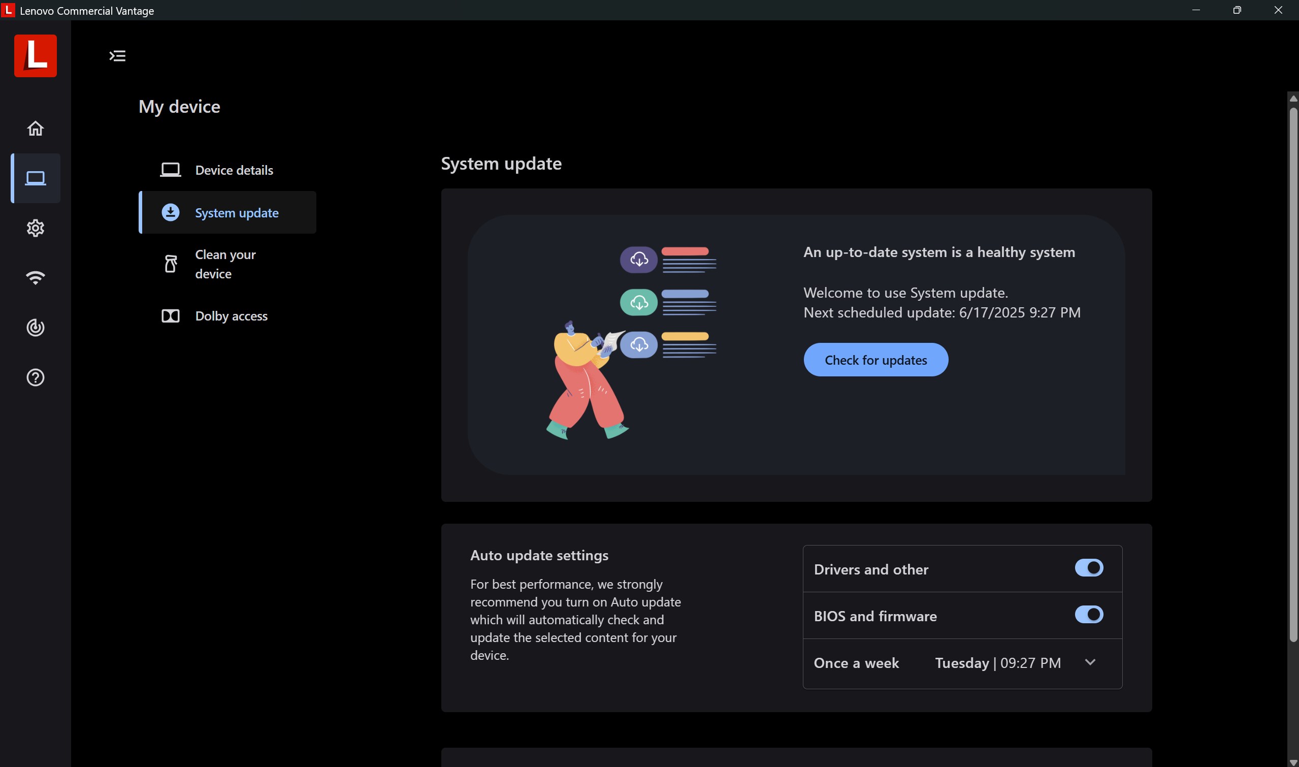 Open Lenovo Commercial Vantage, go to Settings > Updates, then select ‘Check for updates' to keep your device current.