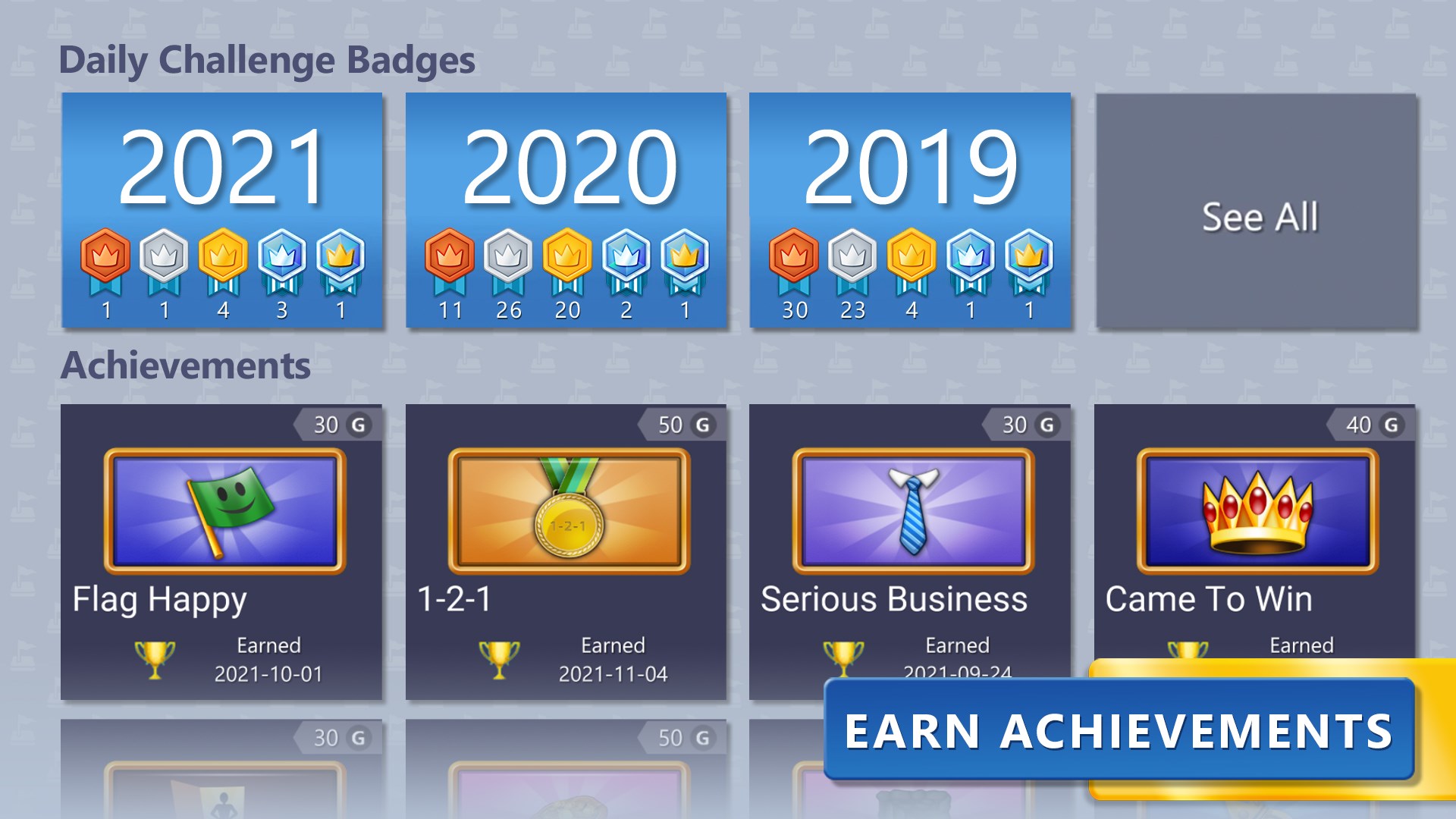 Complete puzzles, challenges, and level up to earn badges. View them in the profile or achievements section accessible from the main menu.