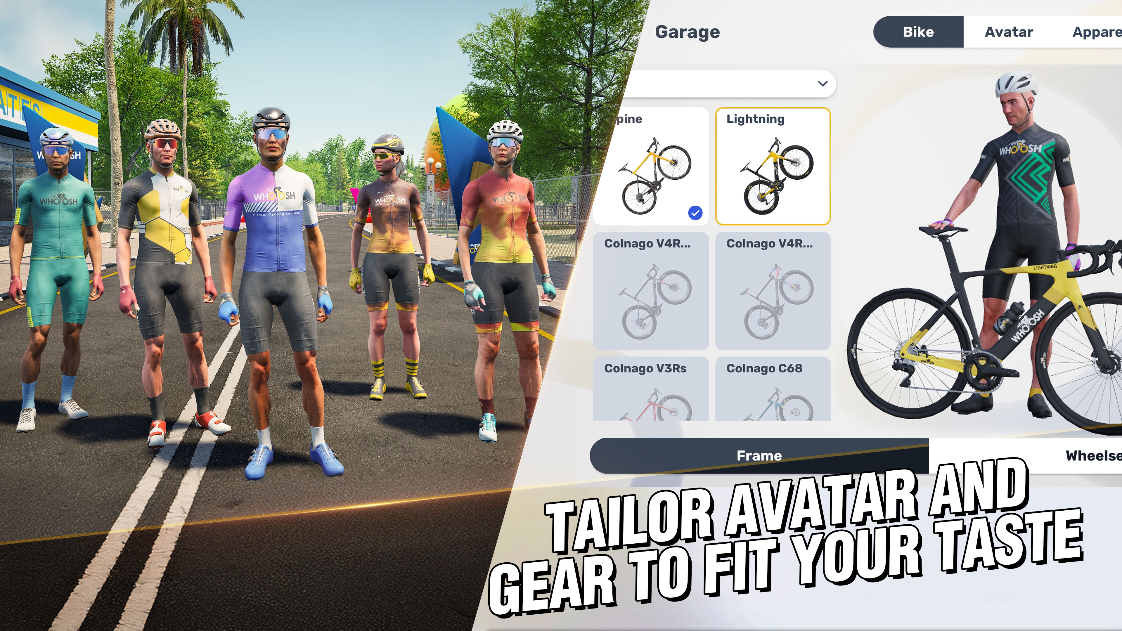 Go to the Garage menu, select your avatar, and choose bikes and accessories from popular brands like Colnago, Ekoi, and others.