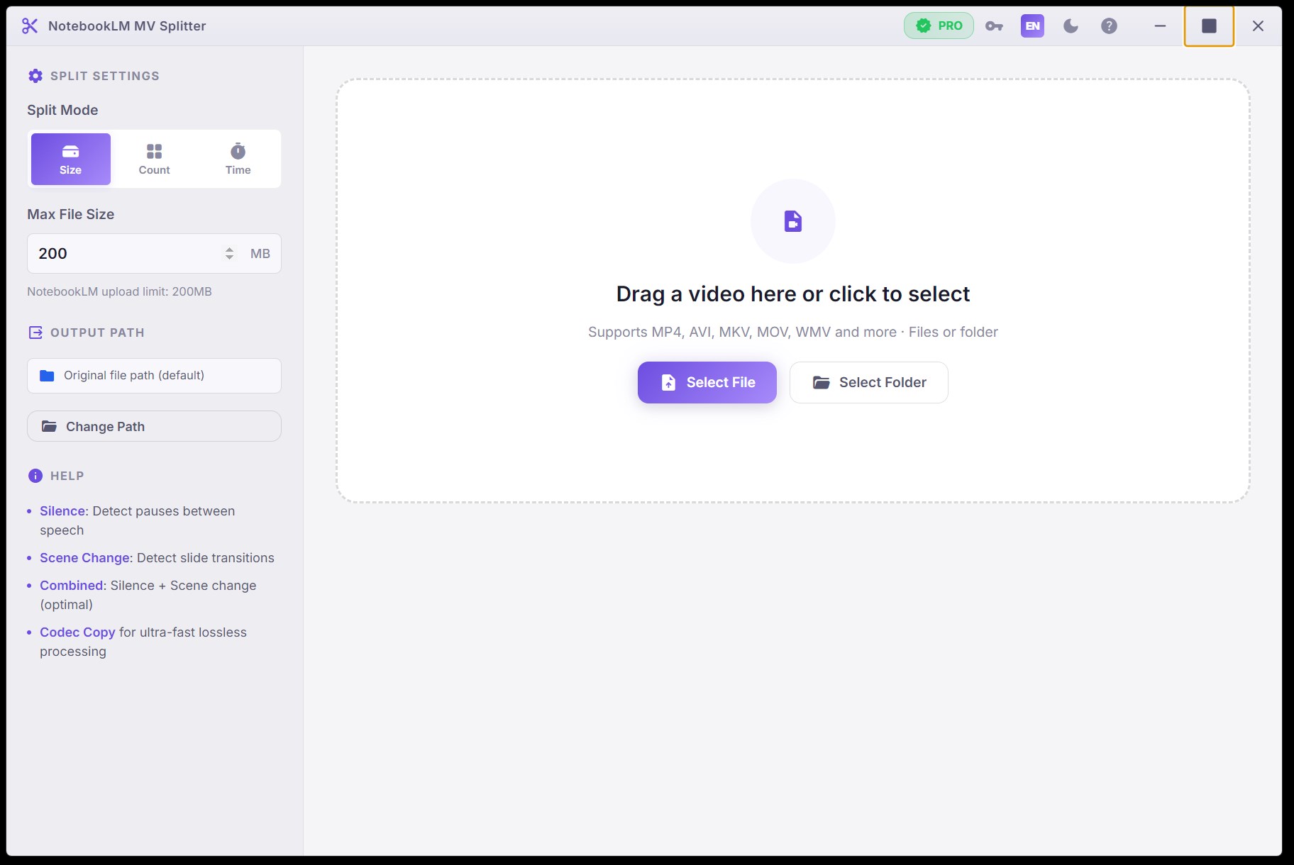 Go to Settings > Split Mode, and select Size-based, Count-based, or Duration-based according to your needs.
