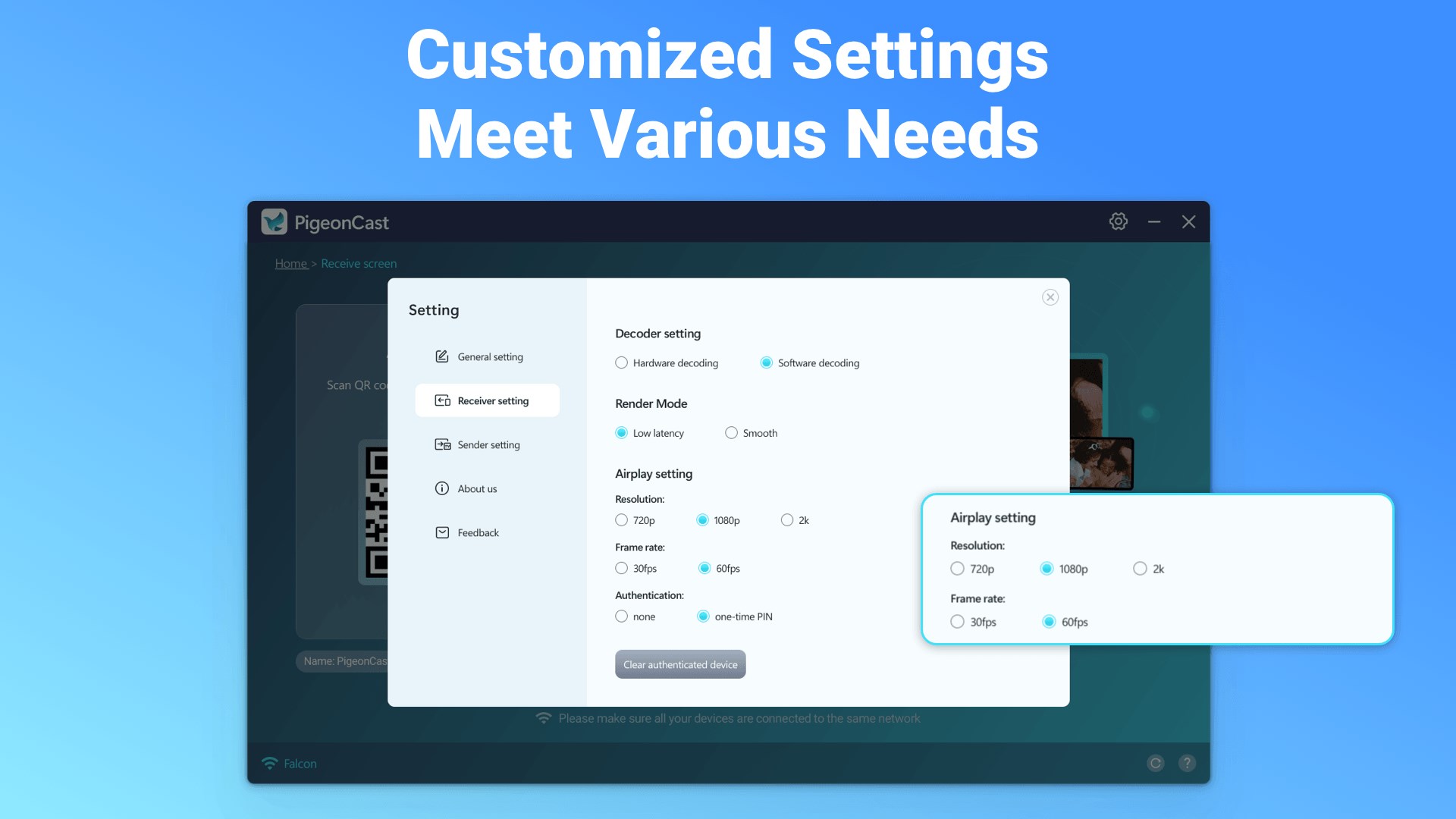 PigeonCast allows wireless mirroring of iPhone, iPad, and Android devices to Windows, as well as casting your Windows screen to TVs, with low latency and high performance.