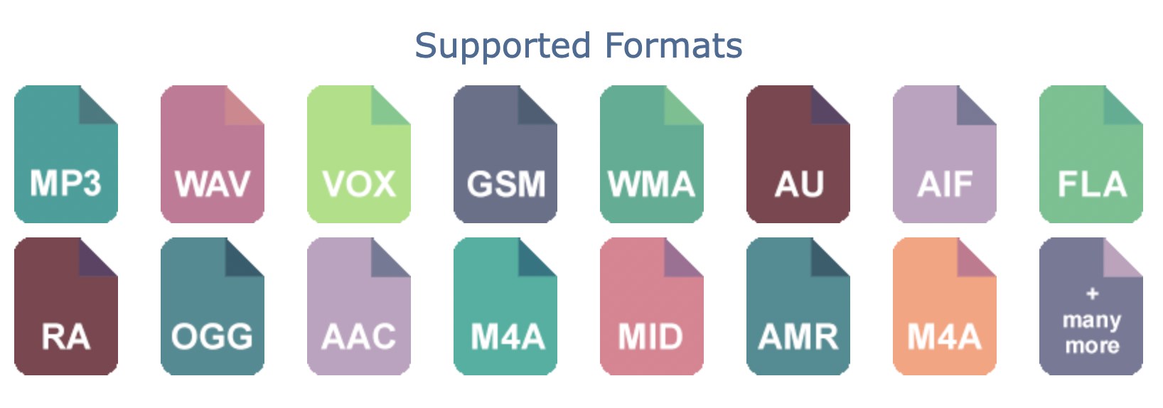 Supports numerous formats like MP3, WAV, VOX, and more, ensuring compatibility with various files.