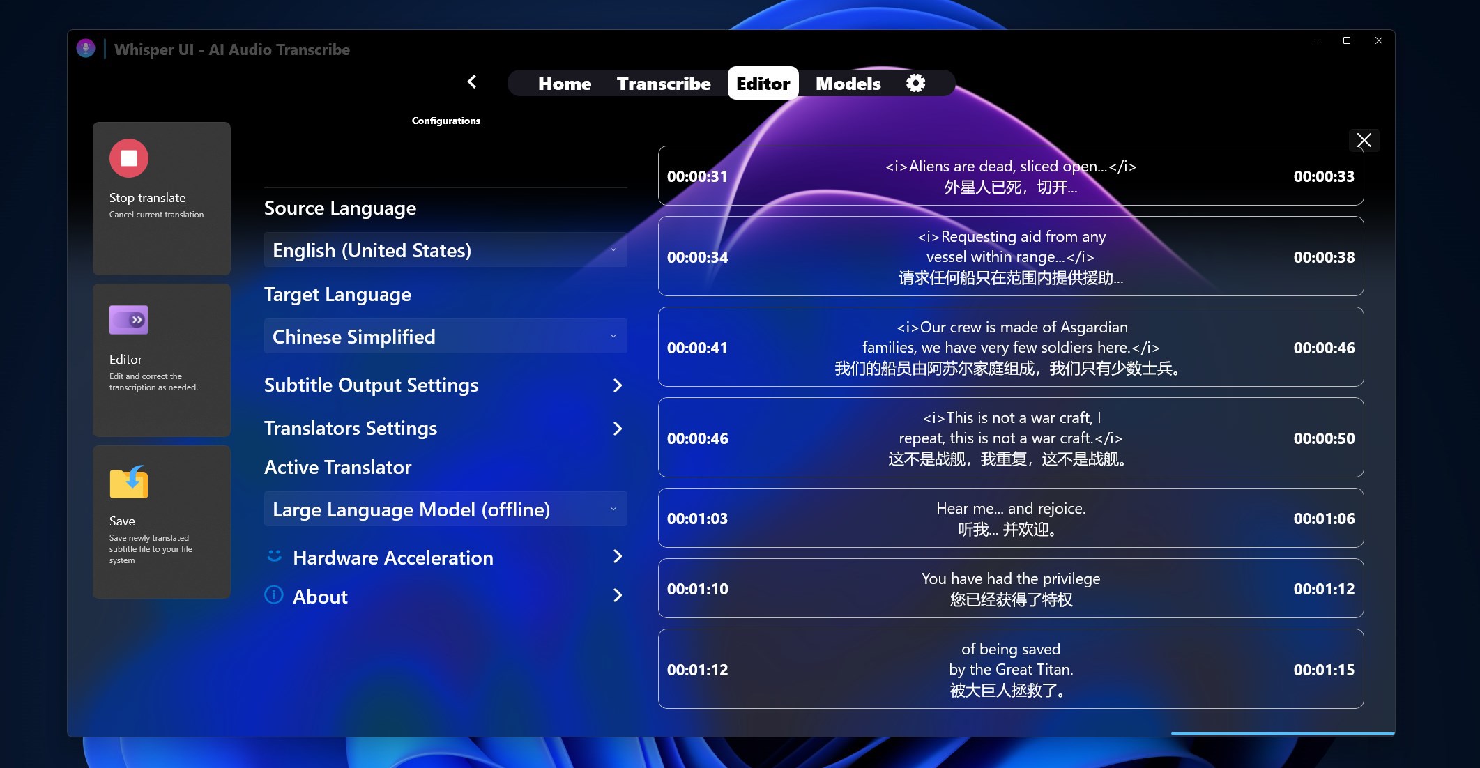How does the offline subtitle translation feature work?